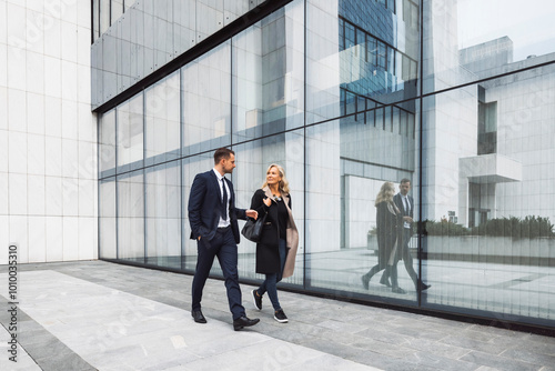 A female leader walks in front of an office building in cloudy weather. She meets a male businessman. They are discussing a new deal. They are dressed in business clothes.