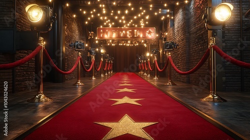 A Hollywood red carpet birthday setup featuring a luxurious red carpet with gold stars, vintage film cameras, and velvet ropes, bright spotlights illuminating the entrance,