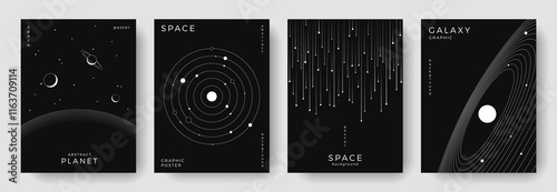 Set of abstract space astronomy backgrounds. Line art planet, galaxy, solar system, meteorite. Science future concept. Cosmic minimalist design for cover, poster, layout, banner, flyer, brochure