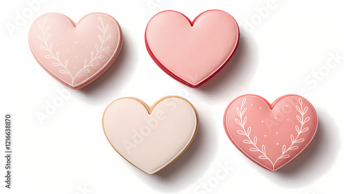 This image showcases a close-up arrangement of four heart-shaped cookies or biscuits on a white background. andy