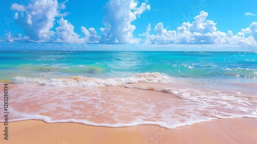 Malowniczy krajobraz plaży z turkusową wodą i złotym piaskiem pod jasnym, pochmurnym niebem