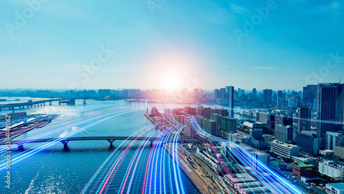都市、空撮、風景、景色、未来、展望、進化、進歩、前進、光、道、希望、社会、テクノロジー、発展、開発、成長、俯瞰、ドローン、ハイアングル、パノラマ、地平線、日本、東京、青空、コピースペース、将来、夜明け、日の出、スピード、通信、イノベーション、高速、経済、IoT、DX、技術、ビル群、建設、インフラ、産業、流れる、物流、ロジスティクス、ポジティブ、文明、現代、ネットワーク、インターネット、cg