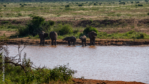 Słoń afrykański (Loxodonta africana), rodzina przy wodopoju na sawannie w Park Narodowy Tsavo East, Kenia, Afryka