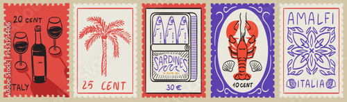 Summer Italy. Amalfi. Vector illustration of postage stamps with image of blue Italian Mediterranean tiles, wine, lobster on a plate, sardines can, sea shell, drawing for poster, placard or print.