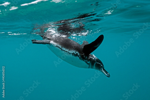 Underwater Shot of a Galapagos Penguin (Spheniscus mendiculus) Diving down from the Surface. Concha de Perla, Isabela Island, Galapagos
