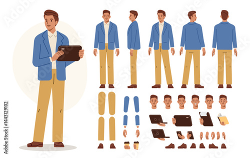 Fashionable business man holding tablet. Character constructor for animation. Front, side and back view set. Body parts, postures, poses collection. Vector illustration.