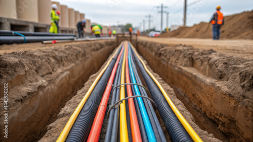 Construction site housing development with underground utility pipes and workers installing cables for infrastructure