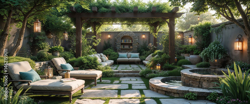 Serene outdoor garden retreat featuring lounge chairs sofa and tranquil water fountain