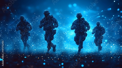 Futuristic soldiers run in a digital world. Wireframe figures sprint across a glowing landscape, embodying a virtual battle. Digital constructs engaged in simulated combat. Abstract blue wireframe