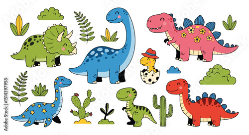 Adobe Illustrator Artwork Set of Adorable cartoon dinosaur collection with various species and playful expressions, surrounded by cheerful plants. Perfect for children's designs and prehistoric themes
