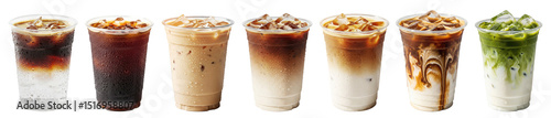 iced coffee types in a plastic cup: iced espresso tonic, americano, oat milk latte, caramel latte, matcha latte