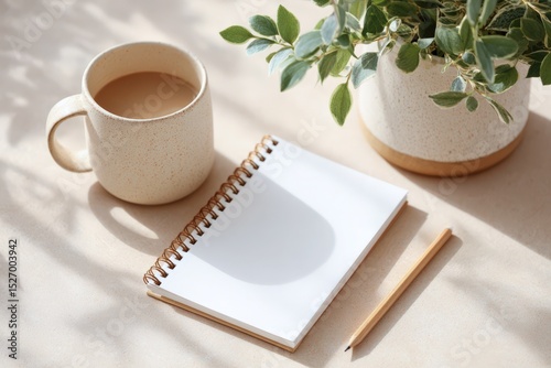 Scandinavian flat lay with spiral notebook, pencil, coffee and plant