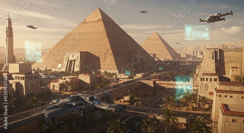 Futuristic cityscape with ancient pyramids and spaceships flying over 3d art sand view giza egypt