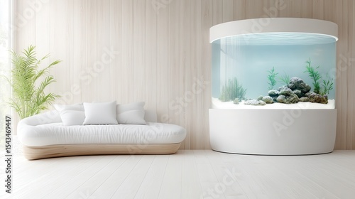 A stylish living room featuring a pristine aquarium beside a sleek, contemporary couch, showcasing modern design aesthetics and the calming effect of aquatic life.