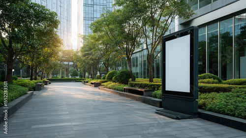 Nowoczesna ścieżka piesza w otoczeniu zieleni i szklanych wieżowców, z widocznym pustym billboardem. Miejsce łączy naturę z miejskim krajobrazem.
