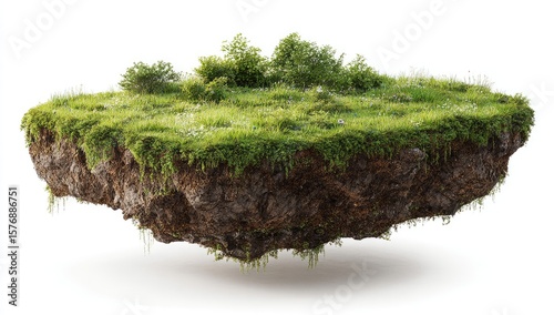 A small, floating island of rich brown soil topped with lush green grass, wildflowers, and shrubs, isolated on a white background