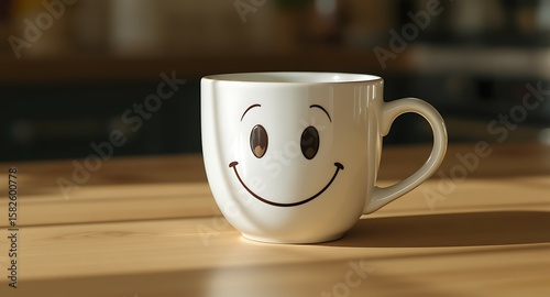 A cheerful white coffee mug with a simple smiley face, sitting on a wooden table in the warm sunlight