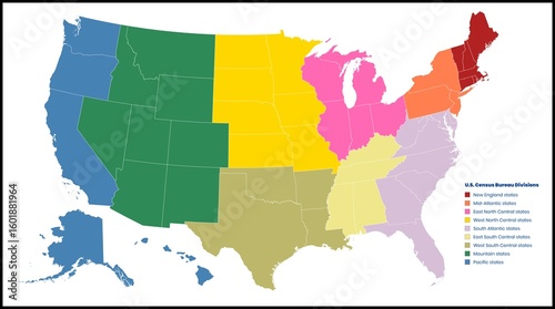 U.S. map showing Census Bureau divisions by region in distinct colors with legend