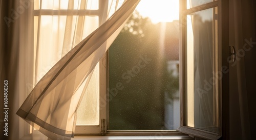 A sheer curtain gently billows in the warm sunlight streaming through an open window, revealing a soft-focus outdoor scene.