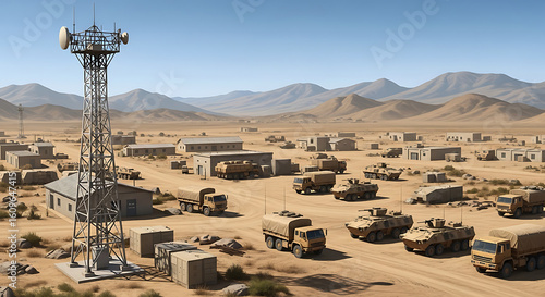 Military base in the desert with communication tower trucks and armored vehicles for defense strategy and national security operations under a clear blue sky