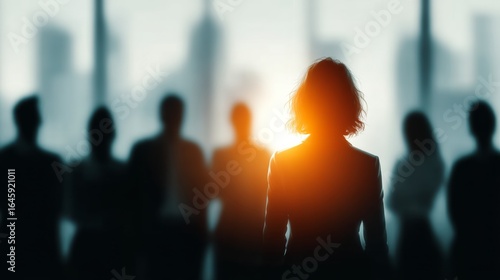 A woman leader stands confidently in front of her team in a modern office, illuminated by bright light