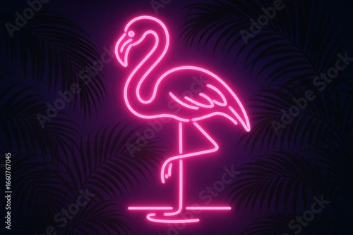Pink flamingo created entirely from neon tubes glowing against dark tropical background