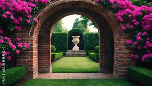 A garden scene viewed through a brick archway with pink flowers, green shrubbery, and a white urn on a pedestal.