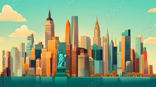 Colorful cartoon of new york city skyline with statue of liberty for urban design