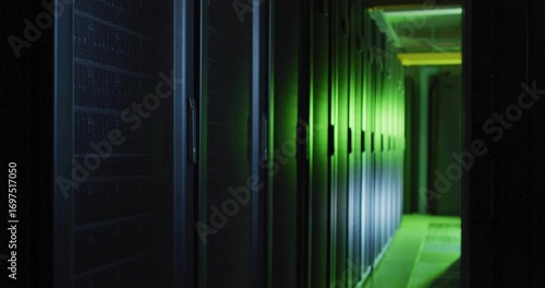 Glowing row of server racks lining data center corridor, with green LED lights and cable trays