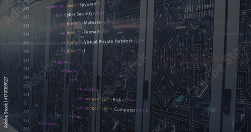 Displaying server cabinets with blinking LED lights in data center, showing cybersecurity HTML code
