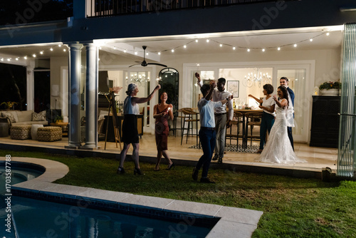 Celebrating joyfully, guests at outdoor wedding reception near pool with string lights