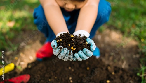 Child holding soil in garden