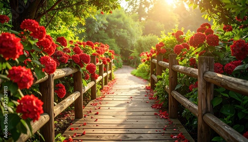 A sun-drenched walkway lined with a rustic wooden fence, adorned with vibrant red flowers, creates a serene and beautiful garden scene.