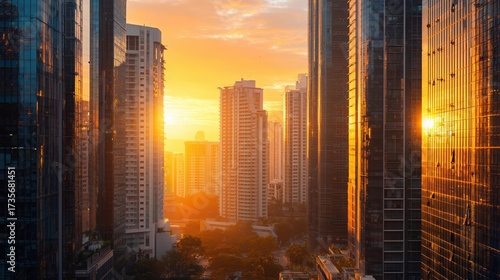A stunning urban sunset illuminating a narrow city street, flanked by towering skyscrapers reflecting golden light.