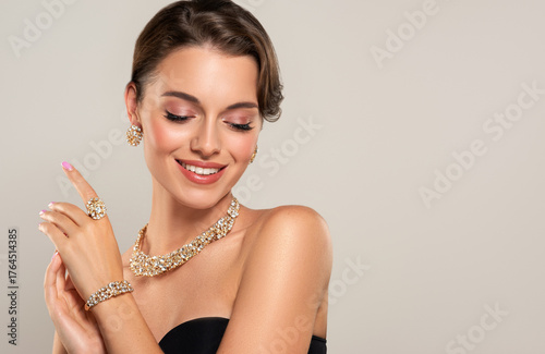 Beautiful girl with jewelry . A set of jewelry for woman ,necklace ,earrings and bracelet. Beauty and accessories. bijouterie