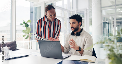 Man, woman and discussion with laptop at startup, documents and review proposal at media company. People, team and computer with paperwork, writer and collaboration with feedback at creative agency