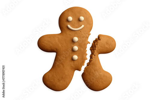Gingerbread man cookie broken into two pieces, showing a clear separation with a transparent background