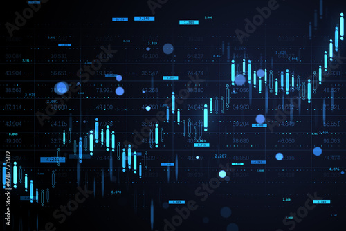 Abstract glowing financial chart with candlestick graph and currency exchange data on dark background representing stock market analysis and trade. 3D Rendering
