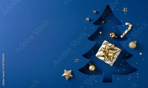 A blue backdrop hosts a dark blue Christmas tree cutout, gold gift box with bow, ornaments, and scattered stars creating a joyful holiday mood for Christmas and New Year visuals