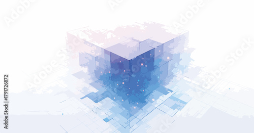 Abstrakcyjny geometryczny sześcian z niebieskimi i fioletowymi odcieniami na białym tle, nowoczesny design