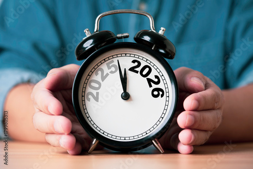 Businessman holding an alarm clock showing the transition from 2025 to 2026 symbolizing time change new year planning future goals strategy and preparation for business and personal development