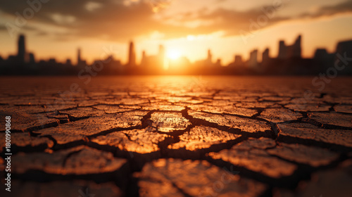 Dramatic sunset over city skyline with cracked earth in foreground. desolate view of drought and climate change