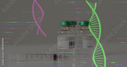 Showing two vaccine vials green caps, syringe resting on lab bench, pink green DNA glitch lines