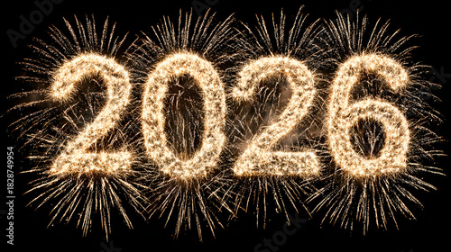 Bright golden fireworks explode in the night sky welcoming the year 2026 with hello happy new year