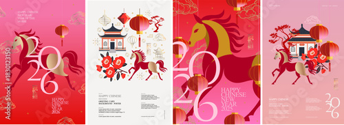 2026 Year of the Horse. Chinese New Year. Vector modern abstract illustration of horse, Chinese lanterns, house in China with flowers for greeting card, poster or background