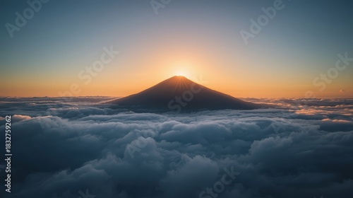Majestic mountain peak rising above the clouds at sunrise with golden light