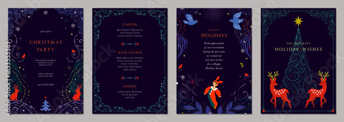 Elegant Christmas templates. Winter Holiday cards with ornate Christmas Tree, Elf, doves, stars, birds, snowflakes, reindeers, rabbits and decorative frames with copy space and greetings.