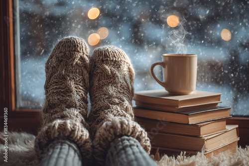 close-up of feet wearing chunky wool socks resting by a rainy window with a mug and books