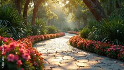 Stone pathway winds through lush garden with vibrant flowers and green plants. Sunlight streams through trees, creating serene and inviting atmosphere. This tranquil scene suggests peaceful walk.