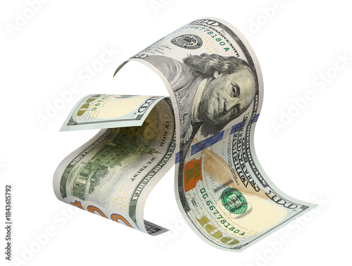 Two flying hundred dollar bills, isolated on transparent cutout background